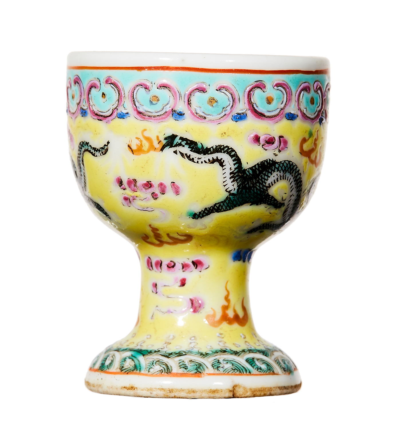 Decorated to the exterior with a band of ruyi-lappet design above a green enamelled dragon on a yellow ground, resting above a band of waves, 5.5cm high