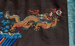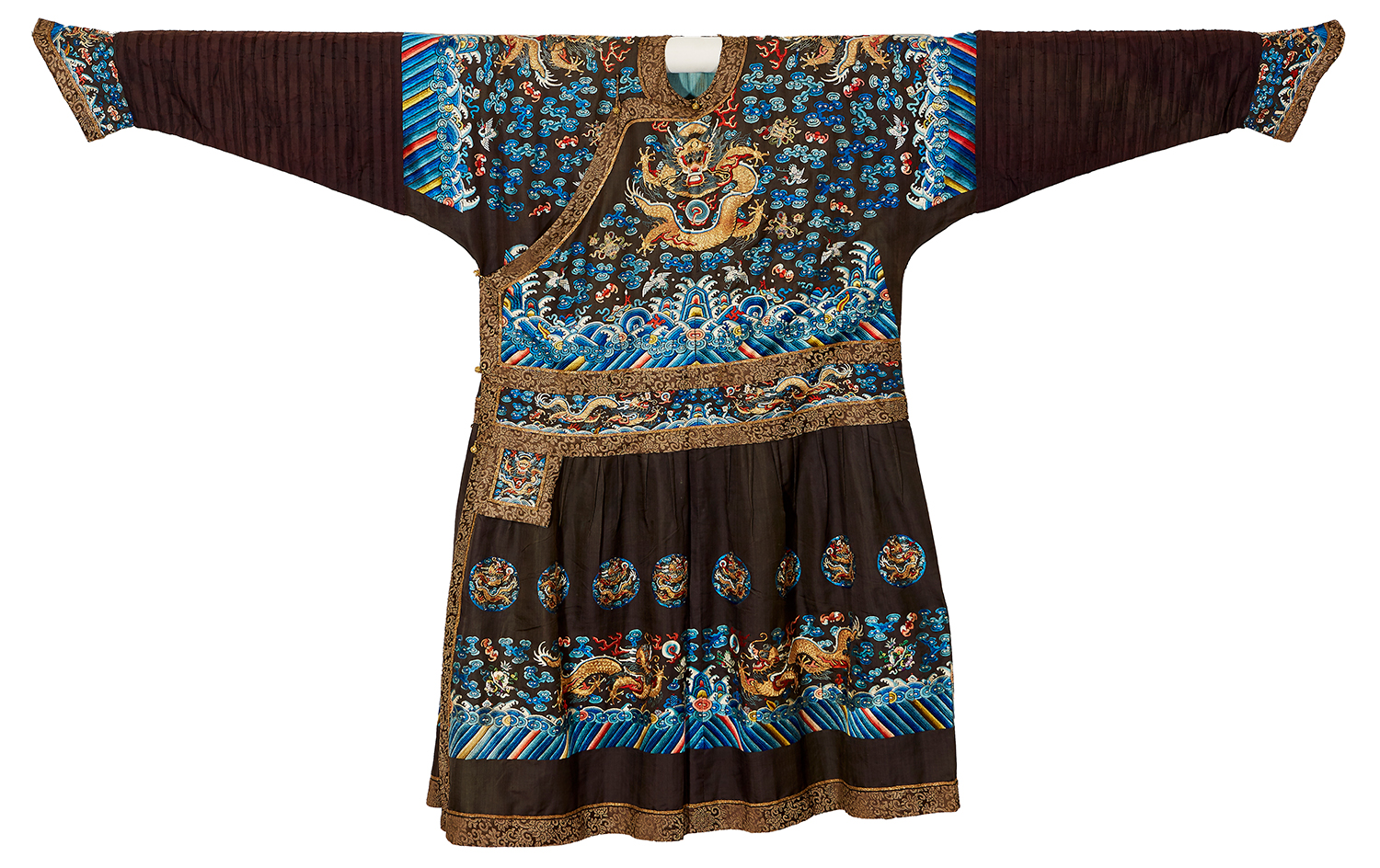 The black silk Autumn Dragon Robe with imperial dragons couched in golden thread, with auspicious Buddhist and Daoist symbols, and medallion roundels of dragons on the skirt of the robe, mounted in a perspex case measuring 240cm width x 15cm depth x 166cm height