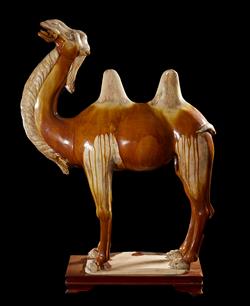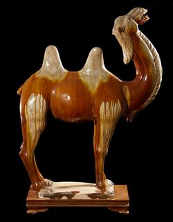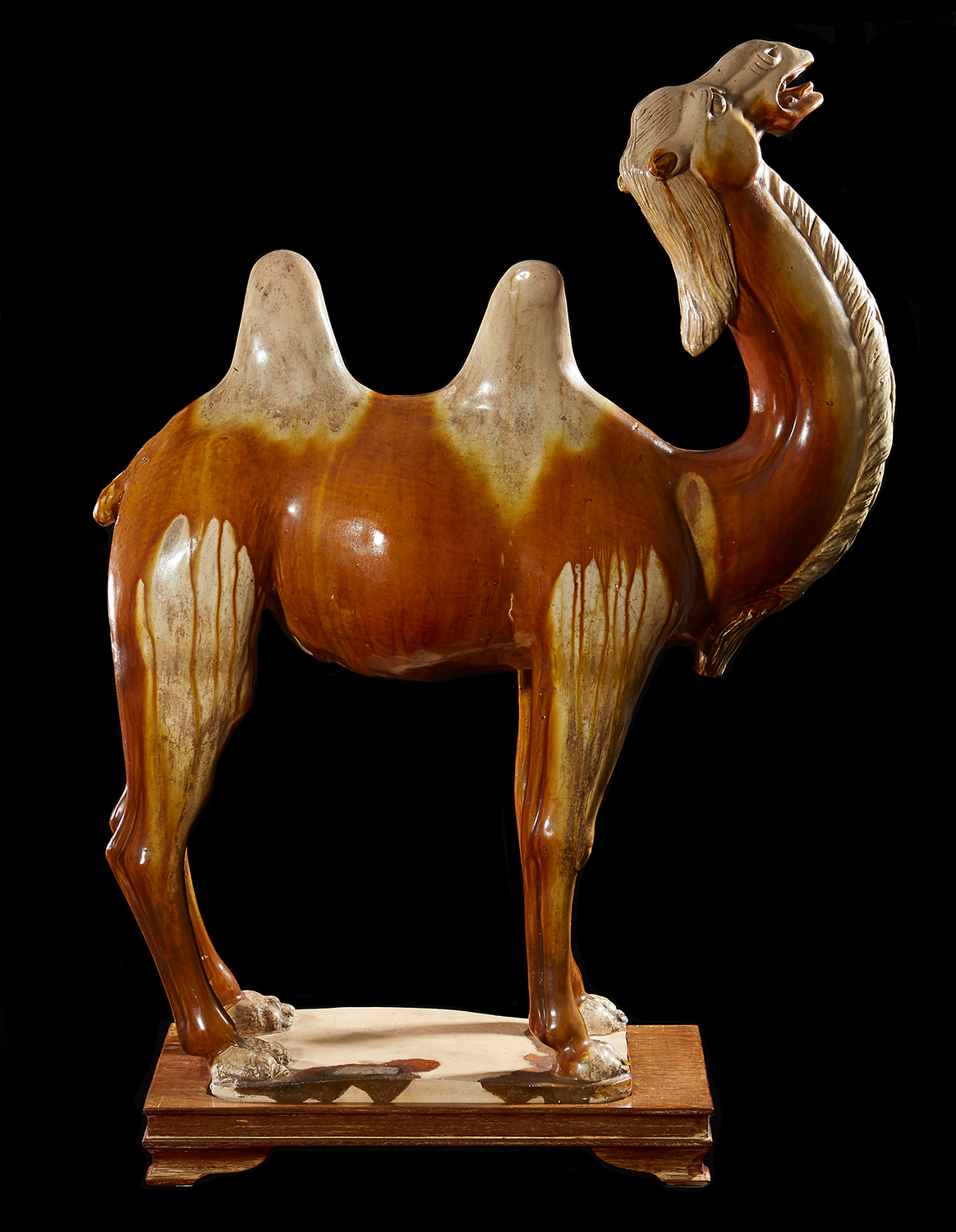 Standing four-square on long legs upon a rectangular base, its long neck raised to support the well modelled head, with mouth open, and nostrils flared, as if braying, the amber-ochre glaze dripping majestically over the body, mouth, legs, and tail. The powerful neck with thick plaits of fur on the underside, with groomed mane. The slender cream-glazed humps leaning in opposite directions; 80cm high with fitted wooden stand. This dating of this figure is consistent with the result of a thermoluminescence test (266 c67), tested prior to October 1990