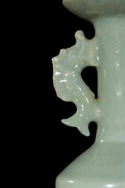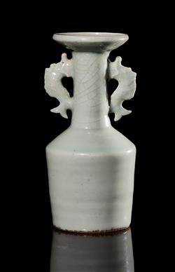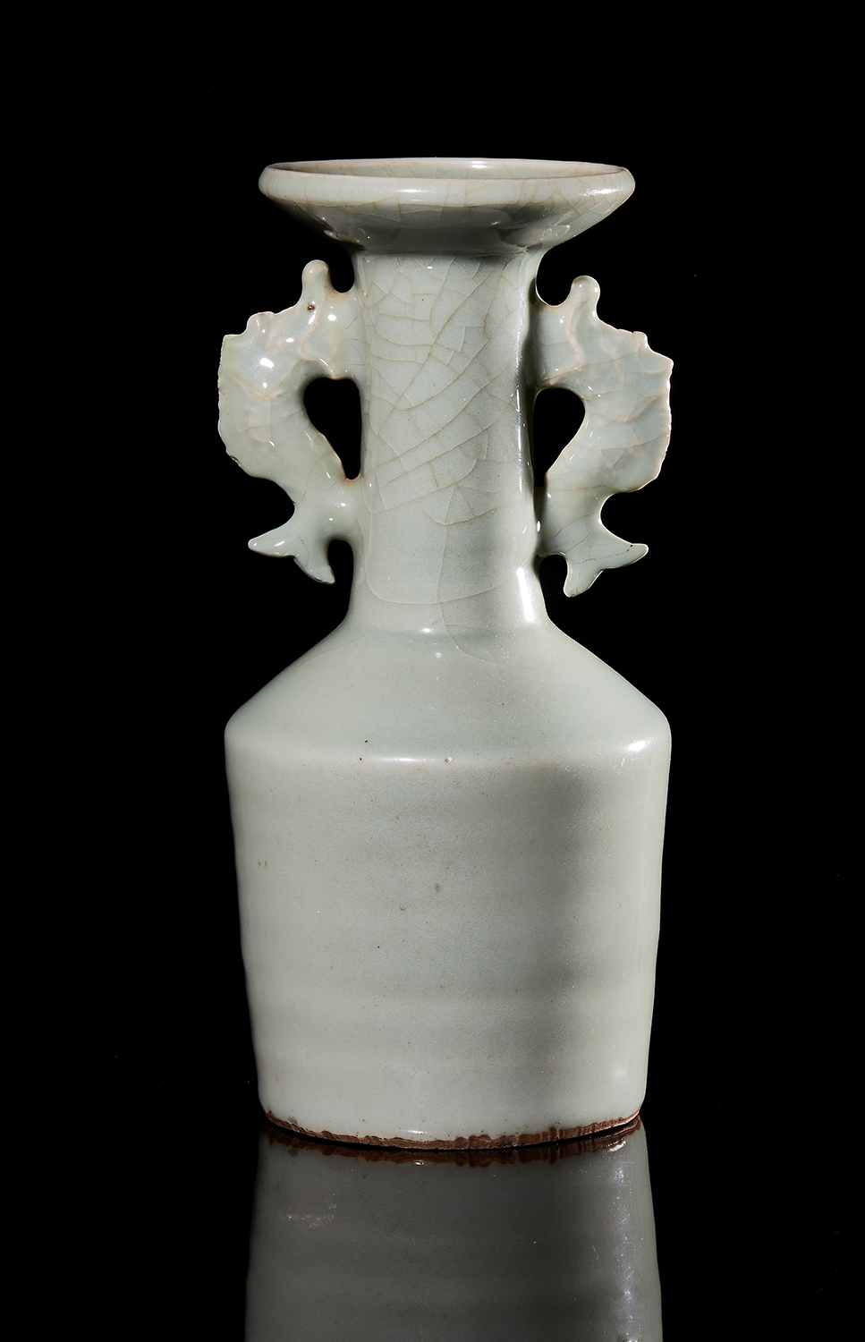 Well-potted, with a cylindrical body, rising from a low foot-rim to a canted shoulder, and terminating by a dish-shaped mouth. The neck with crackle glaze, flanked by an applied pair of serpentine dragon-fish handles. Covered overall in a fine bluish-green glaze, the unglazed hand-pared foot-rim revealing the dark brown dressing, with glazed base, 26.5cm high