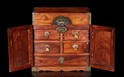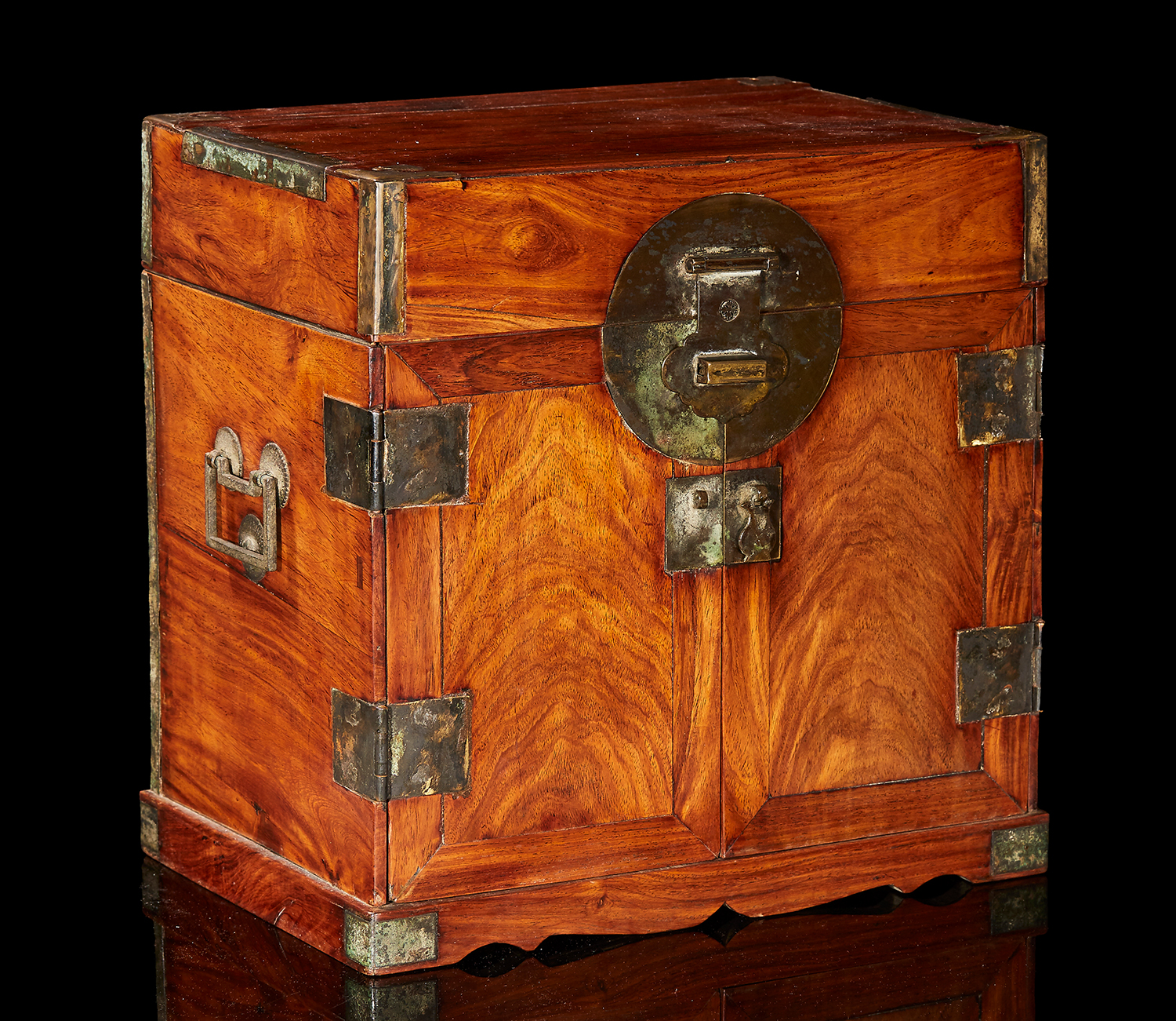 The beautiful yellow rosewood cabinet, of classical form, the lid lifting to reveal an inner tray and to release the two front rectangular doors, which in turn reveal the inner five drawers, all brass-mounted original fittings, with rectangular handles at the sides, and two 'hu' vase-form handles at the front, resting on a shallow base with a gentle cut-out scroll at the front, 33 width x 23 depth x 32cm height