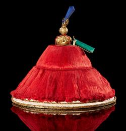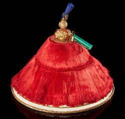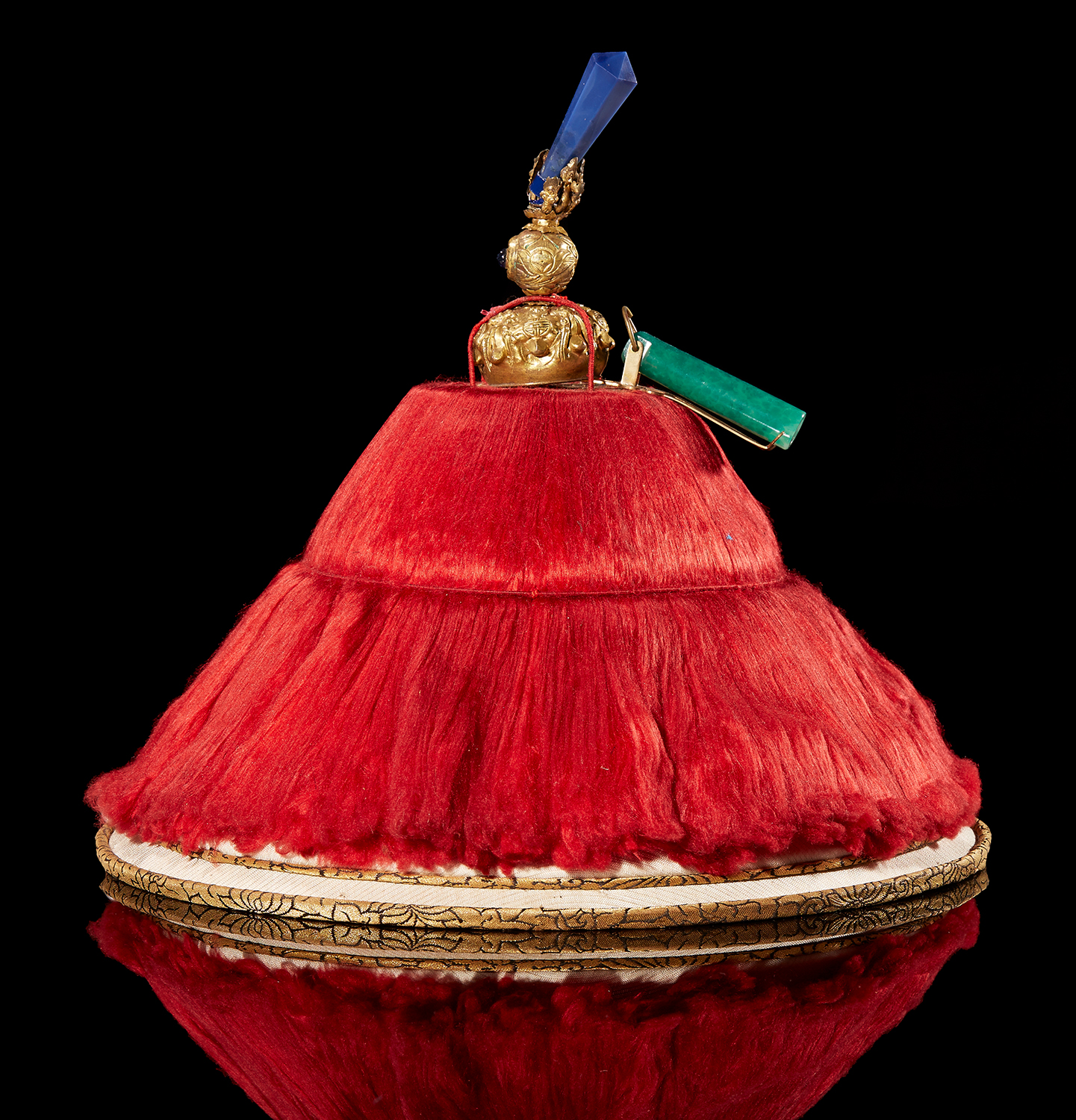 The gilded hat spike indicates a fourth rank by the blue Peking glass spike and blue cabochon. The official would wear this hat when wearing his chaofu robe and piling collar. The hat is covered with a red flossed silk instead of the traditional tassels. A centrally placed (simulated) pearl on the rim indicates the front of the hat, with green peking glass plume holder. The hat with original box. Hats of this style rarely appear on the market. The laws pertaining to the jewelled hats were written in 1636. The jewel on these hats closely resembles the lamaist stone called Rdo-rje 'master' stone, symbolising a pure mind, the gem capable of cutting through any substance, but which itself could not be penetrated. Many priests of the lamaist church wore hats surmounted by such 'master stones'.