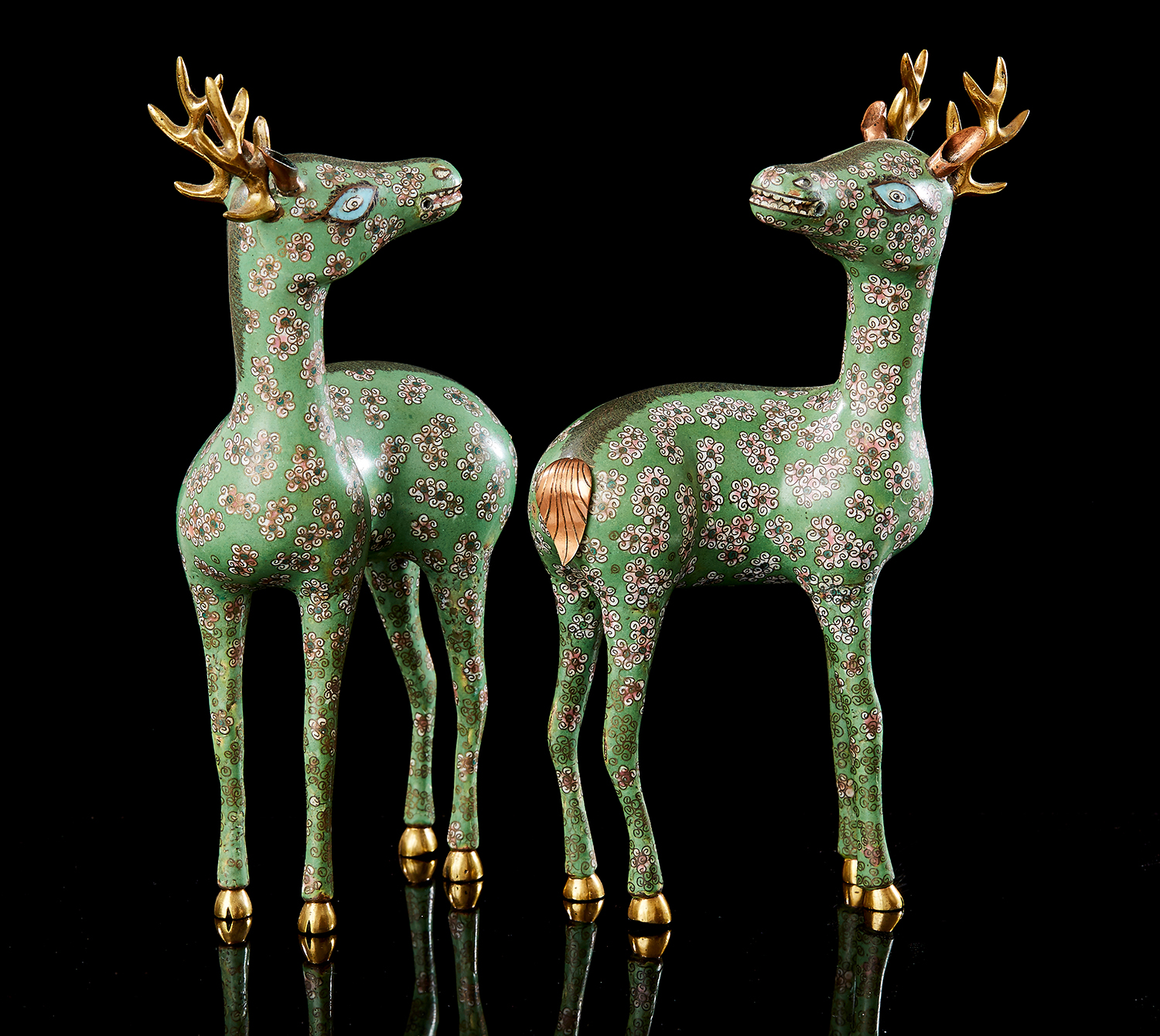 The lovely standing figures, with their heads turned, one facing to the left, the other to the right in mirror image, finely cast with gilt metal antlers, ears and hoofs. Their bodies decorated with scattered flower-heads of pink and blue in gilt outline, a black mane all on a lovely apple green ground, their faces finely detailed, the eyes with turquoise, and navy, their mouths with red enamel lips and white teeth, 25cm high, 14cm length (2)