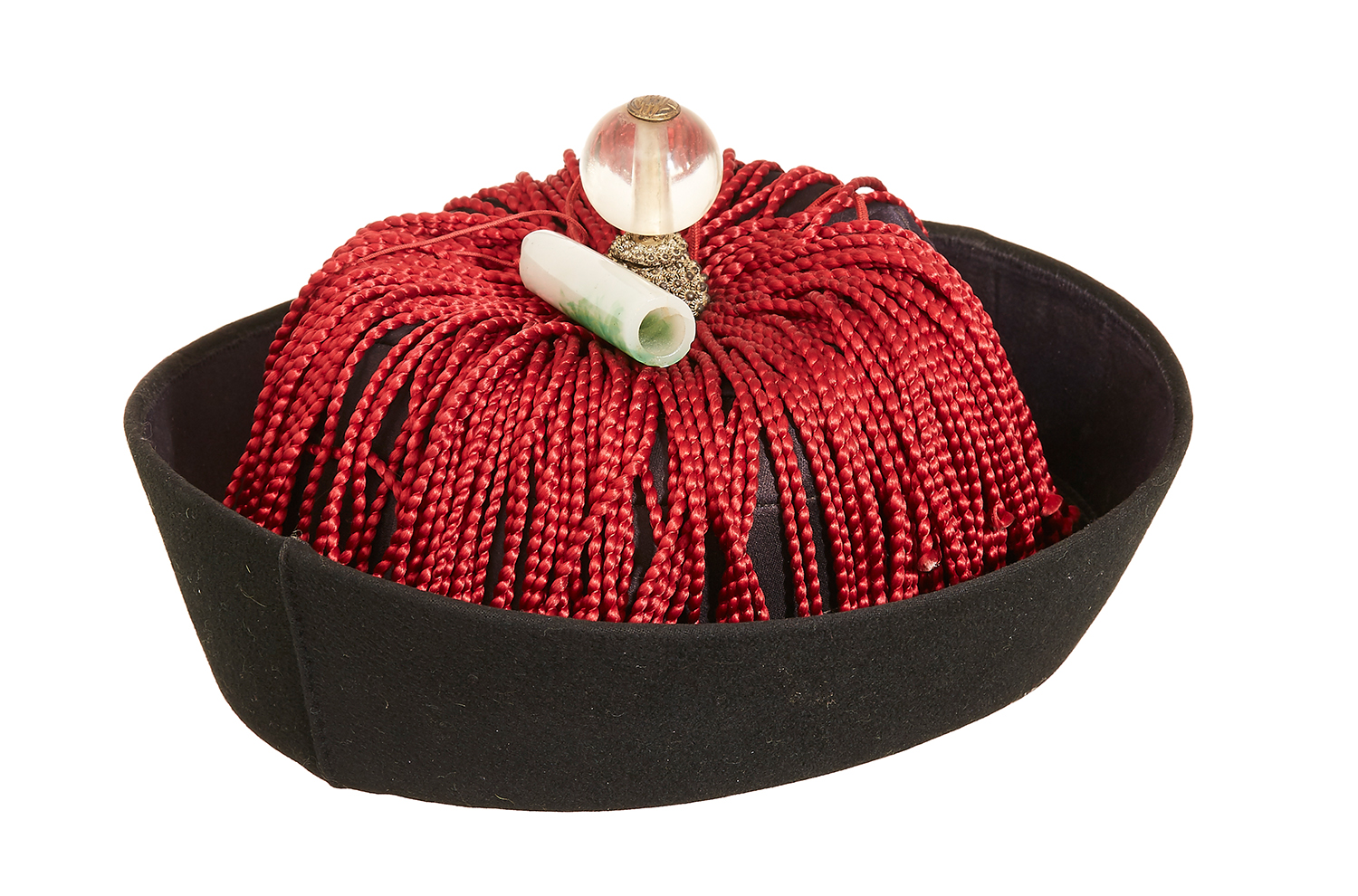 The plumes were awarded for service to the throne and would be transported from hat to hat as the seasons changed. This winter court hat represents the second style of crown decoration where braided red silk tassels were used rather than densely packed red silk floss.