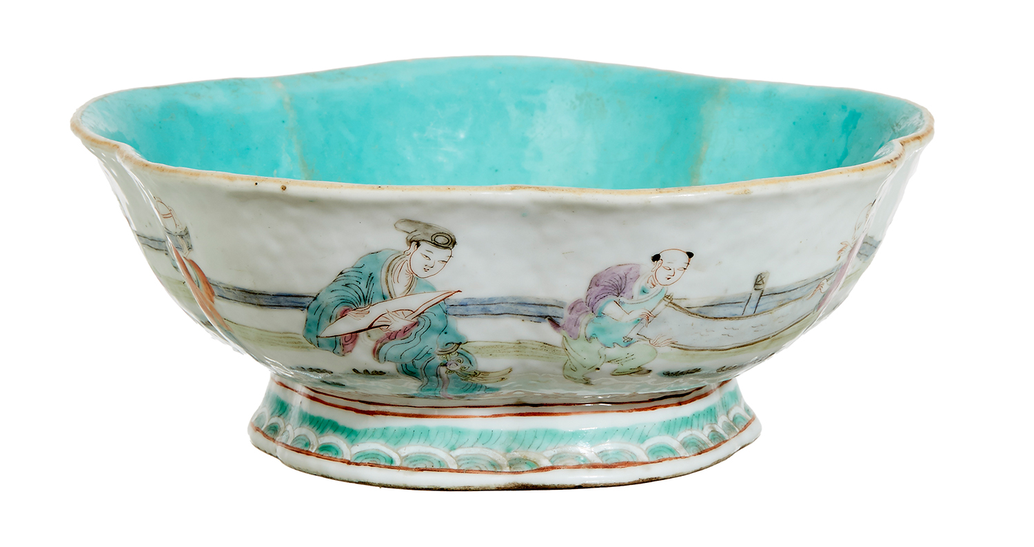 The exterior decorated with overglazed enamels, depicting figures in scholarly pursuits, the interior of the bowl covered in an overall turquoise glaze, the base with six-character mark in red overglaze, 21.5cm diameter