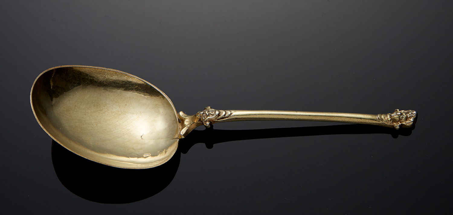 The oval bowl with hallmarks, the stem with maidens head finial and engraved with initials IL, 39 grams, 16.5cm