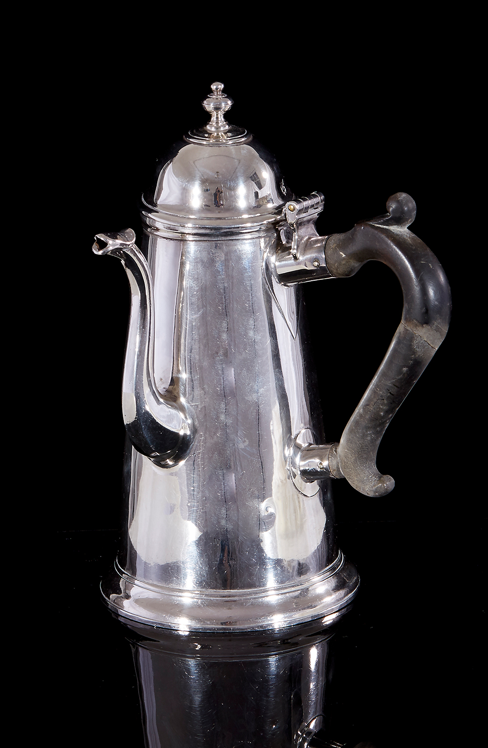 Of tapered cylindrical form with domed cover and faceted spout with scrolling wooden handle, the base engraved AR, hallmarks to cover and pot, total weight 523 grams, 21cm high