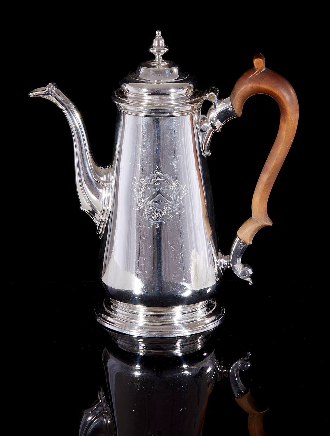 Of tapering cylindrical form with tucked in foot, the stepped dome cover with bell finial, scrolling wooden handle, engraved with crest and armorial, total weight 952 grams, 24.5cm high