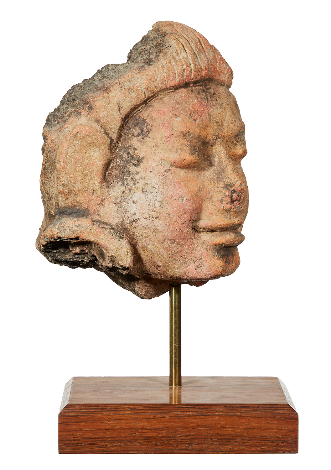 A CLAY HEAD OF A DEITY, DVARAVATI, THAILAND, 6TH-8TH CENTURY