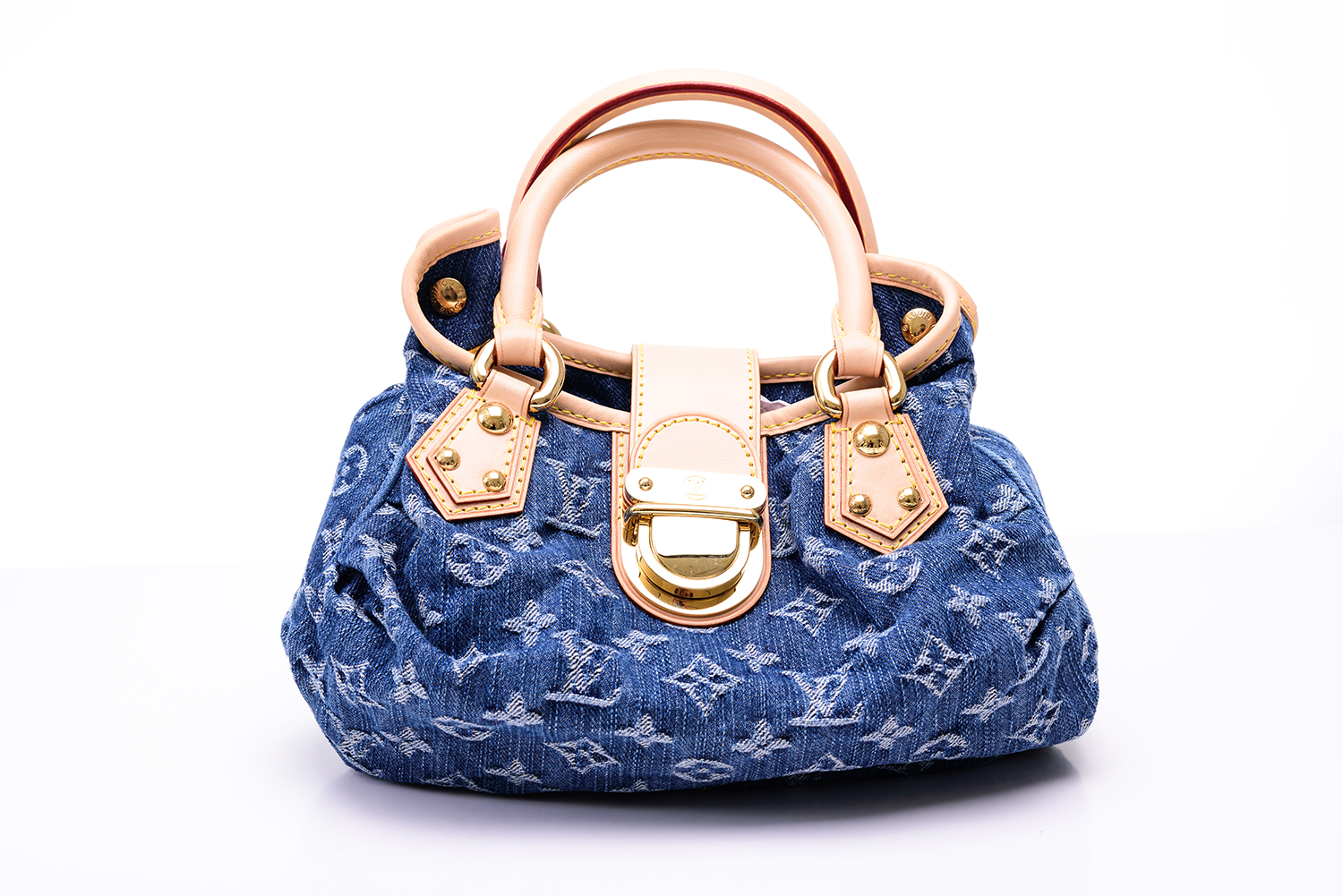Styled in denim monogram with tan leather handle and gold metal hardware, 19 x 21 x 7cm.