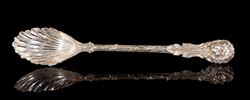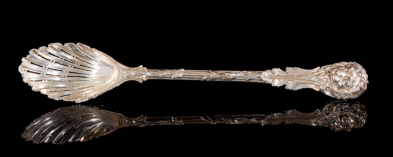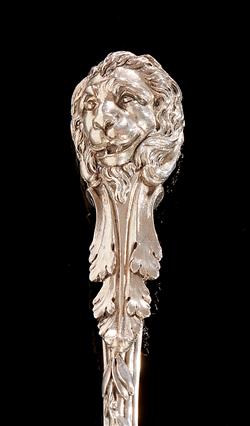 The finely modelled lion mask handle above acanthus and vine wrapped reeded stem terminating in pierced frilled bowl, marks obstructed by piercing, 280 grams, 31cm long