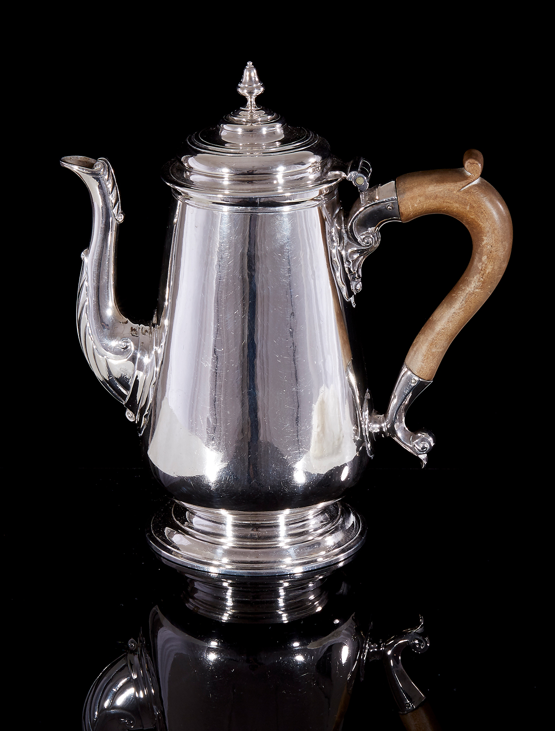 Of plain tapering cylindrical form with folded in foot, the bell shaped finial on stepped dome cover, acanthus capped spout and wooden handle, 881 grams, 22.5cm high