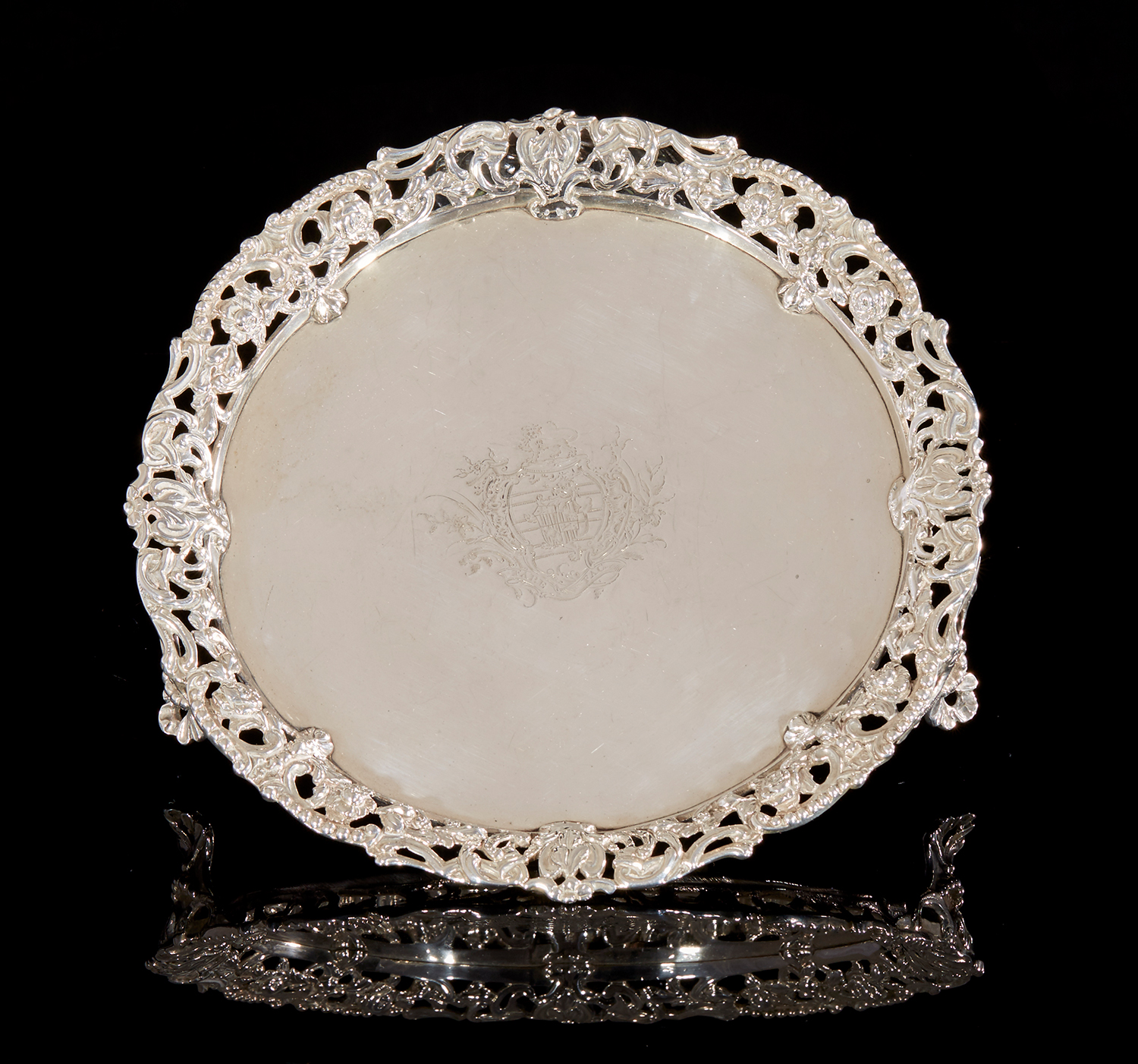 With pierced rim finely cast with beaded C scrolls, flower heads and foliage, the well engraved with coat of arms of Fairfax with Bangnell in pretence, on three pierced feet, 417 grams, 18.5cm diameter