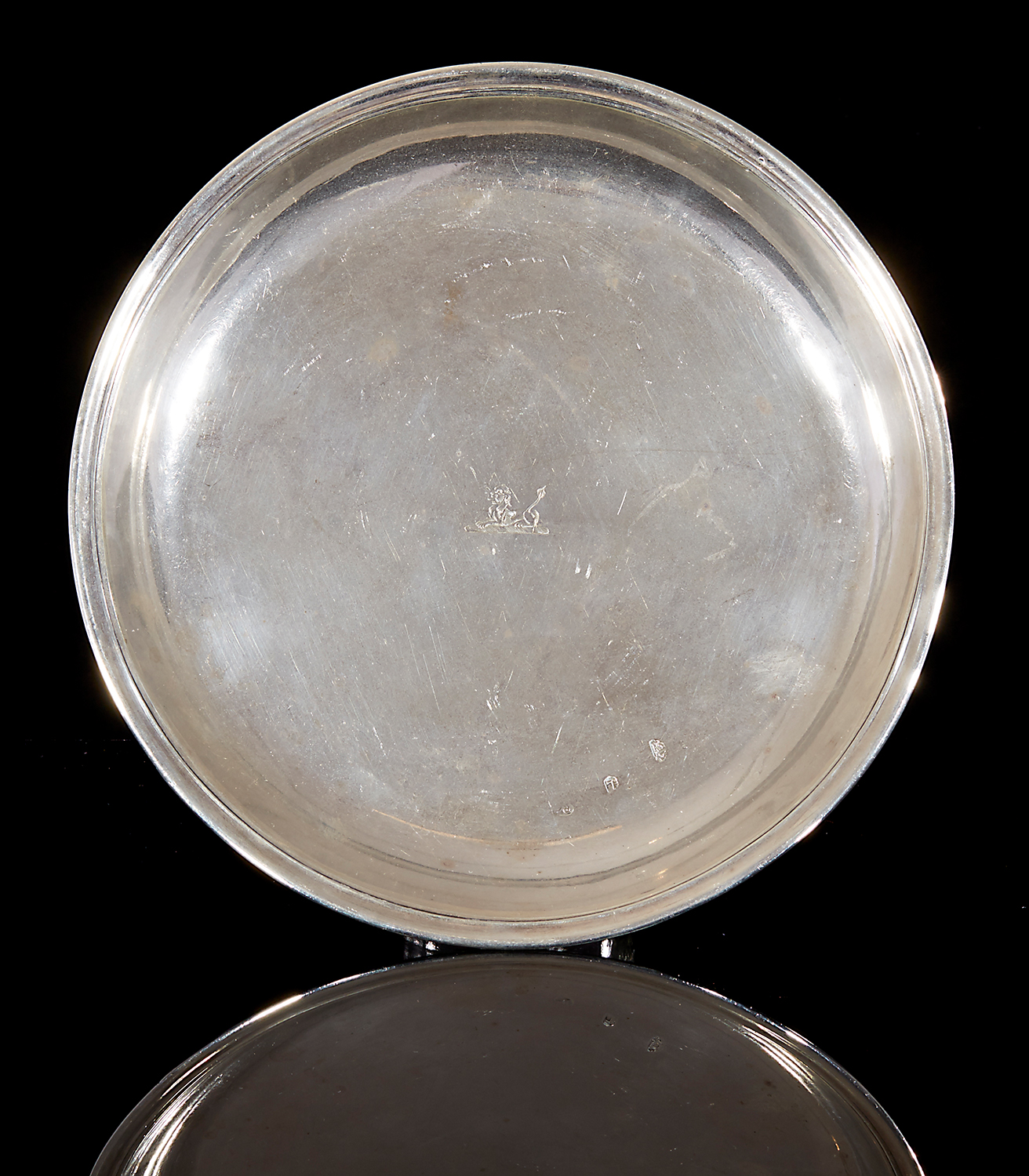 Of plain circular form with everted rim, engraved with crest, 440 grams, 23.5cm