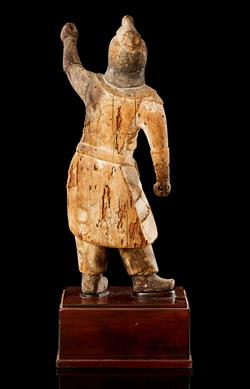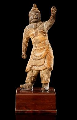 Depicting one of the four guardian kings (shitenno), wearing ancient Chinese-style armour, his left arm raised (missing weapon), traces of original pigment, 57cm high including base (the figure 46.5cm high)