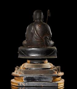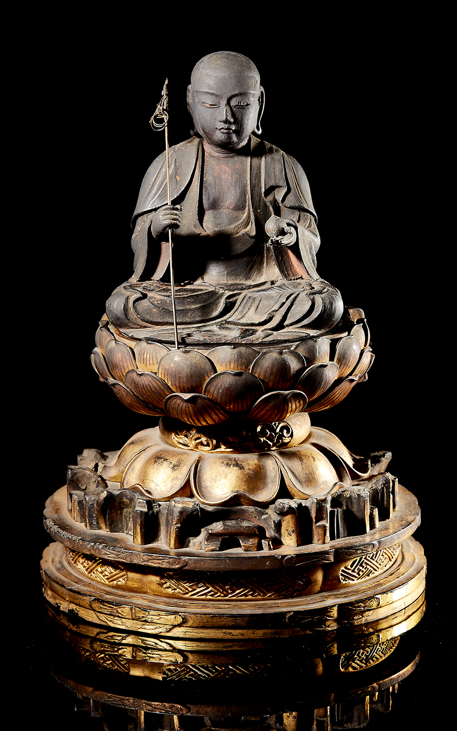 Jizo seated on a gold lotus pedestal (later Edo addition C.1800) shown in the guise of a serene monk with shaved head, his right hand carrying Shakujo (staff) and in his left a Tama or Buddhist jewel, 34cm high including pedestal (the seated figure 17cm high)