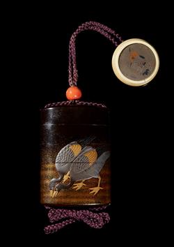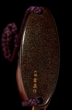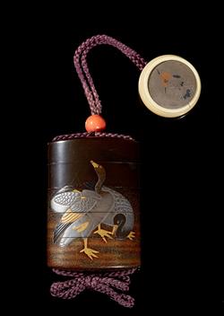 Of classic form, the roiro ground shading to nashiji, main decoration of two geese in silver and gold takamakie with kirikane highlights to their feet and similar theme continuing on the reverse, ensuite kagamibuta netsuke of a sparrow flying amongst foliage, signed Yamada Yoshioki Tsuku, 8cm high