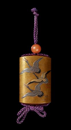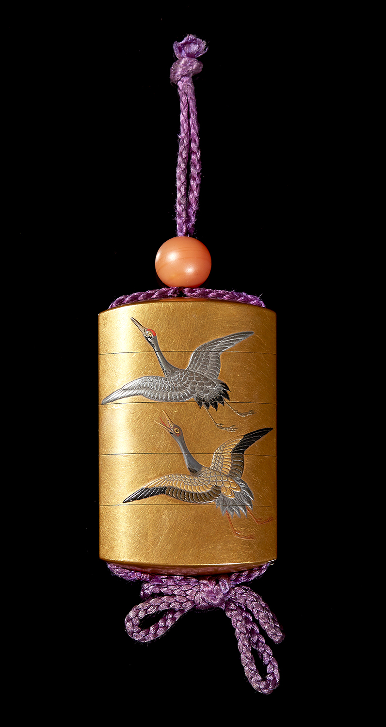 Bearing a rich kinji ground and lacquered with three hiramakie and takamakie cranes in flight and two cranes on the reverse. The details in gold, silver, black, red and lacquer and interior rims and shoulders in fundame, signed: Jitokusai Gyokuzan with Red pot seal, 7.5cm high