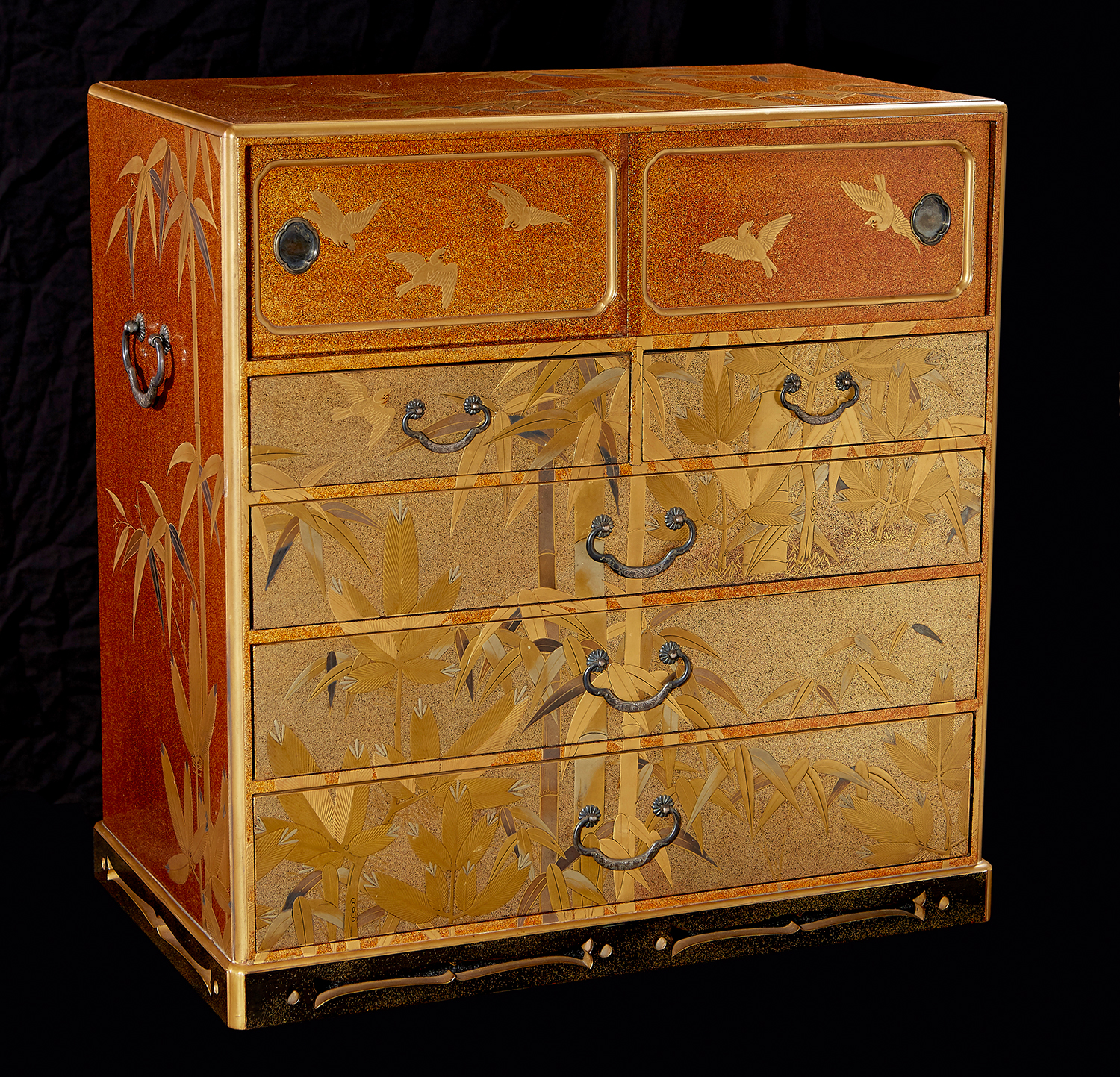 Comprising three main drawers, two smaller drawers and top sliding doors, decorated overall on a rich nashiji ground with main theme of sparrows flying among bamboo in hiramakie and takamakie, the interior drawers in nashiji, silver door pulls and carrying handles, 45cm width x 28cm depth x 47cm height