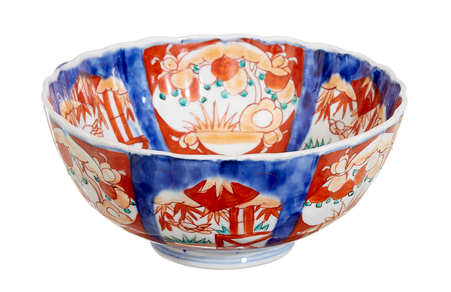 of circular form with a scalloped rim, the exterior painted with floral panels, the interior with six similar panels with a central design of a traditional basket of flowers, 19cm diameter