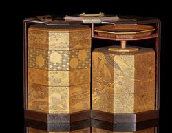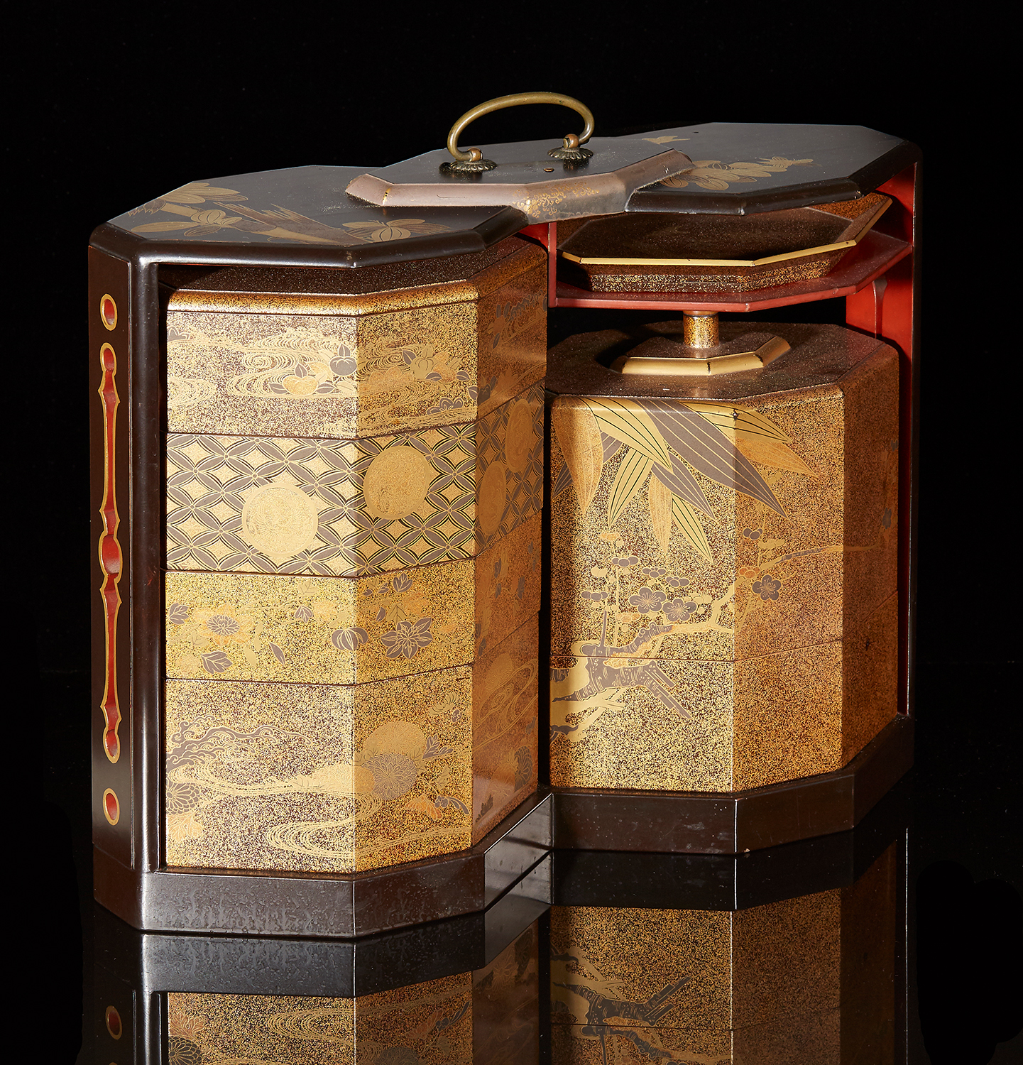 the double hexagonal frame lacquered in roiro and decorated with bamboo in hiramakie and copper-gilt carrying handle, the set comprising; a hexagonal four-tier stacking food box decorated with classical flora and meandering stream in gold lacquer, tokkuri (sake container) in nashiji and hiramakie and a hexagonal food tray with hiramakie sparrows and bamboo on a nashiji ground, 42cm width x 17cm depth x 31cm height