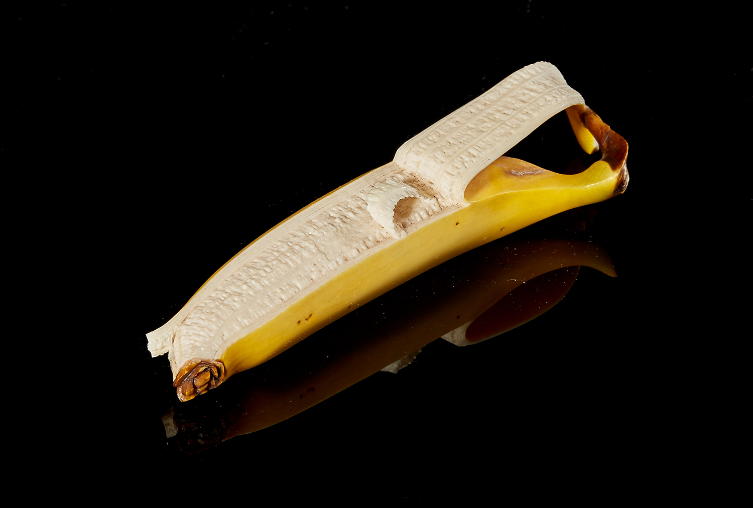 A naturalistic Japanese stained and carved ivory study of a banana, partly peeled and realistically rendered. Meiji/Taisho period, circa 1900-1923, 12cm length