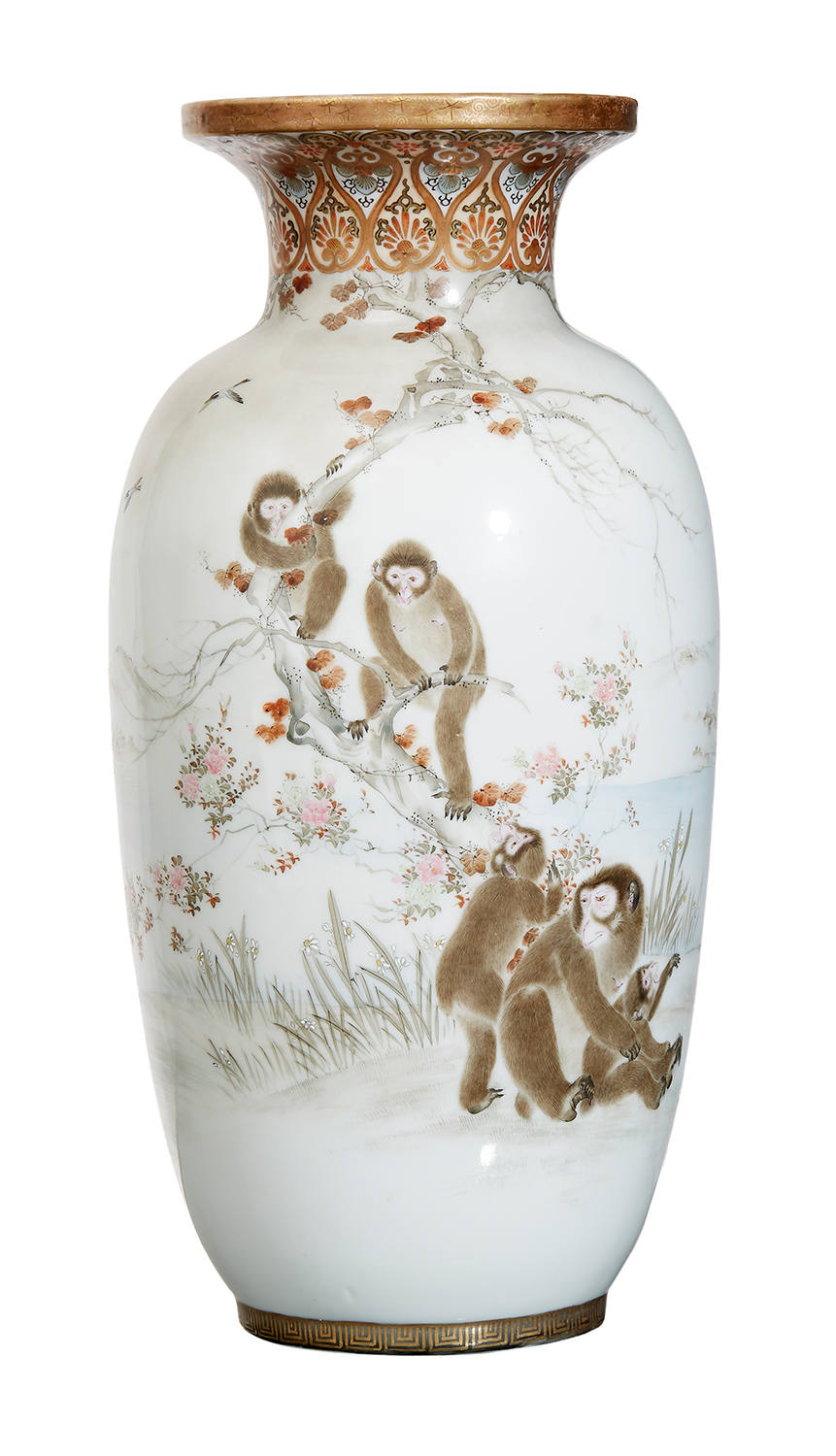 of baluster shaped and painted with monkeys amongst spring flowers, signed Machimoto Owari-ya Seizo, 35cm high