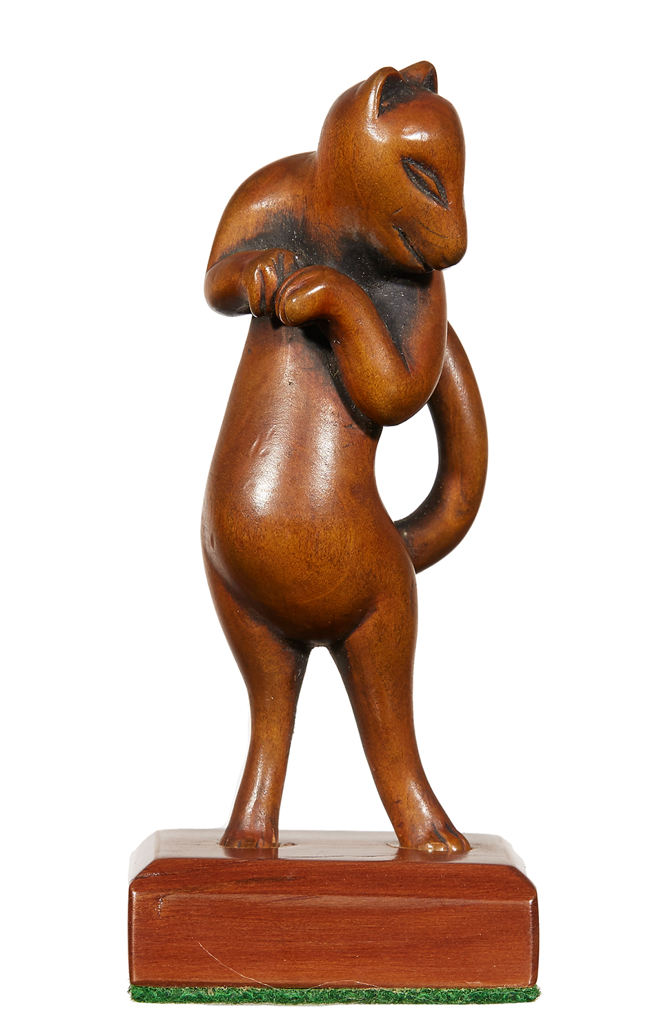 Standing upright with its front paws held to one side of its head with short pointed ears, narrow eyes, long pointed muzzle and slightly open mouth, natural himotoshi on tail section, 7.5cm high