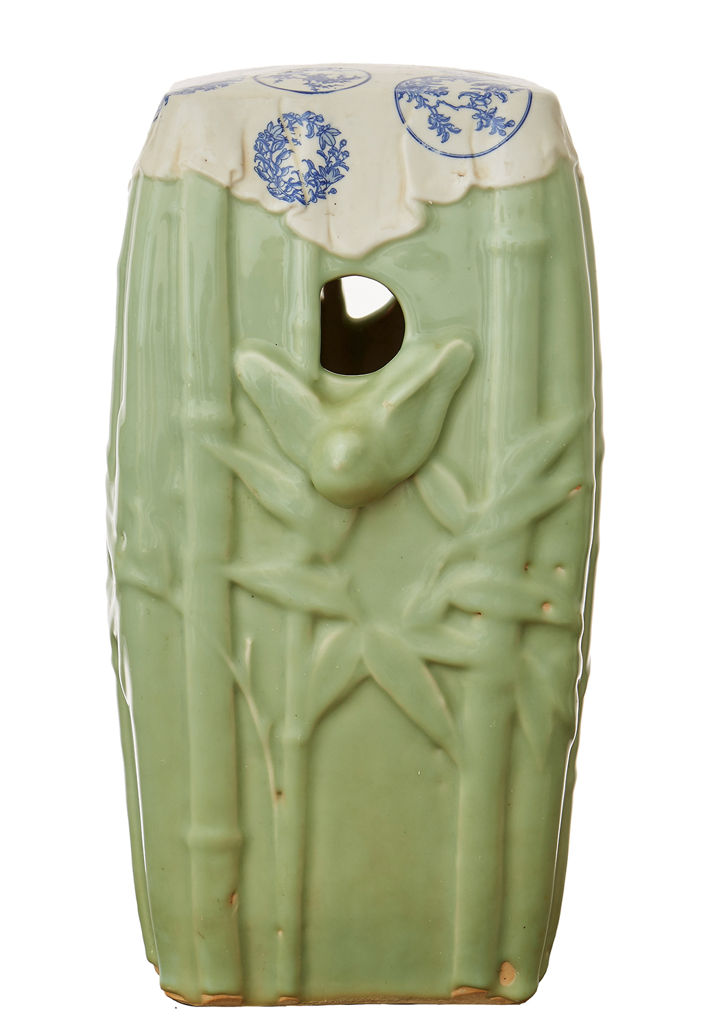 square shaped garden seat, raised relief design of bamboo in celadon porcelain, the top with a pattern of blue and white floral roundels, unsigned, 50cm high