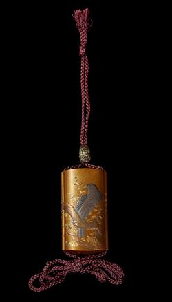 Of typical form and on kinji ground, a five case silver and black hiramakie and takamakie inro depicting an imposing hawk on a prunus, amongst spring blossom, the reverse with a continuing Sakura design, signed Shosai, 8cm high