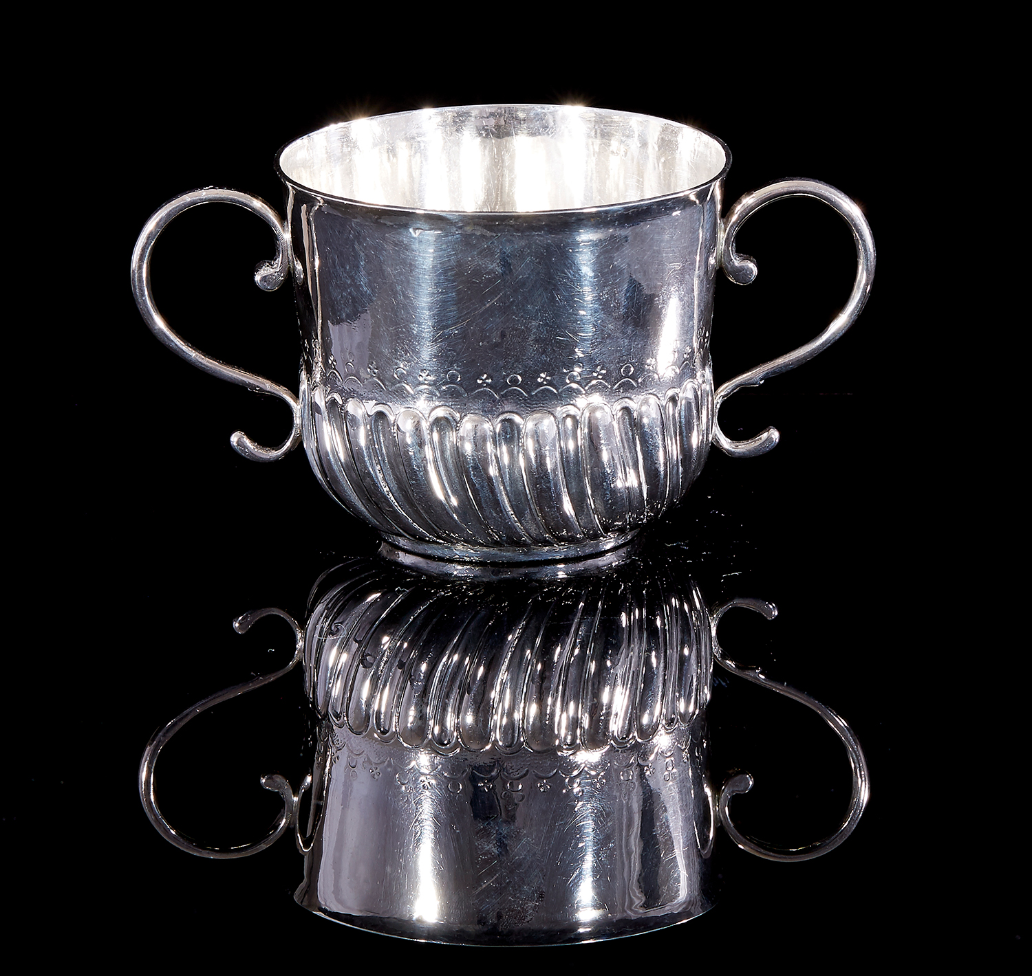With S scroll handles on curved lobed and fluted lower band, bright cut band and crest, initialled T.P M.D 1696 to base, makers mark worn, 115 grams, 13.5cm at widest