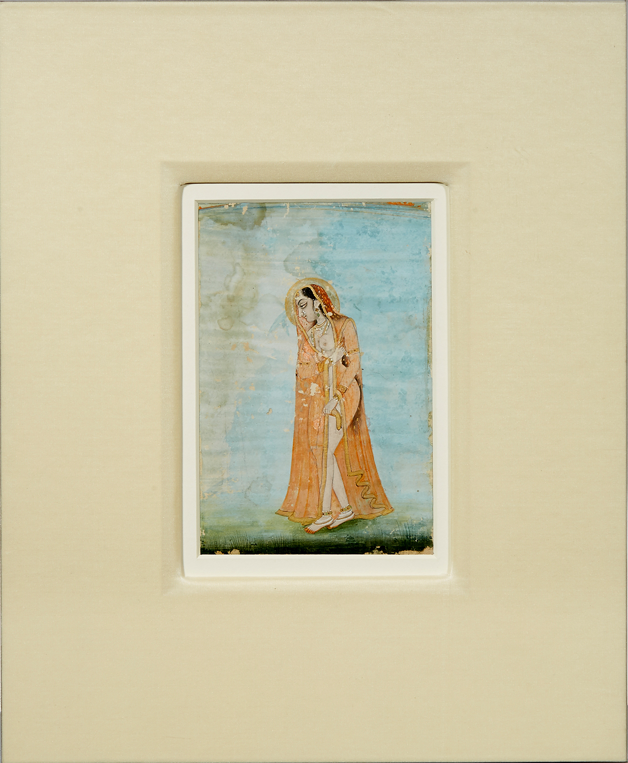 Discolouration and water stains down one side, surface paint loss visible in spots around edge and on sari