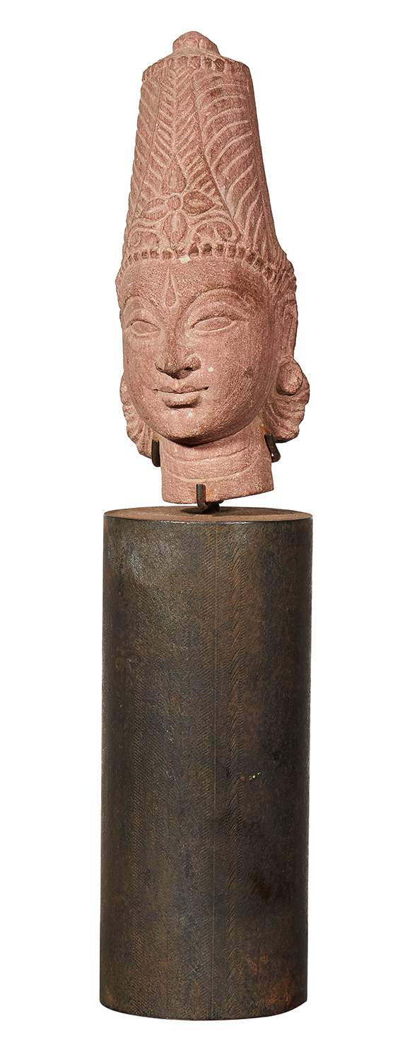A PINK SANDSTONE HEAD OF A DEITY, INDIA