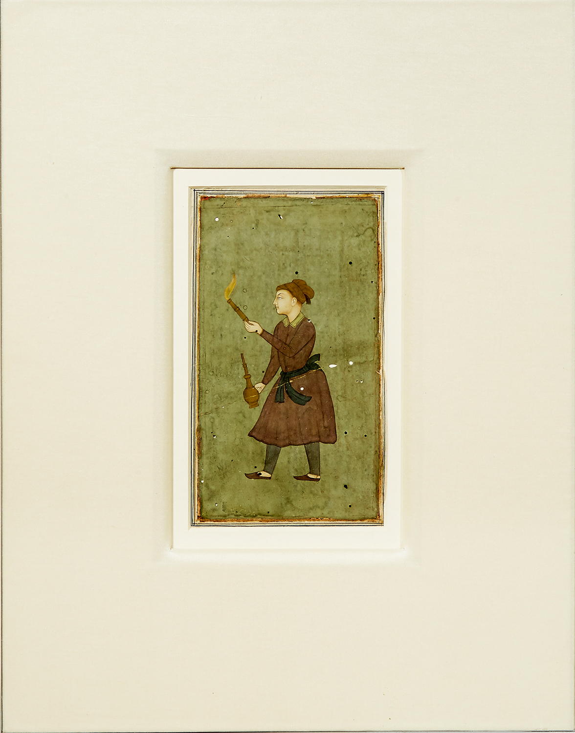 Painted on a sparse grey ground with gilded edge, 8 x 14cm within perspex box frame