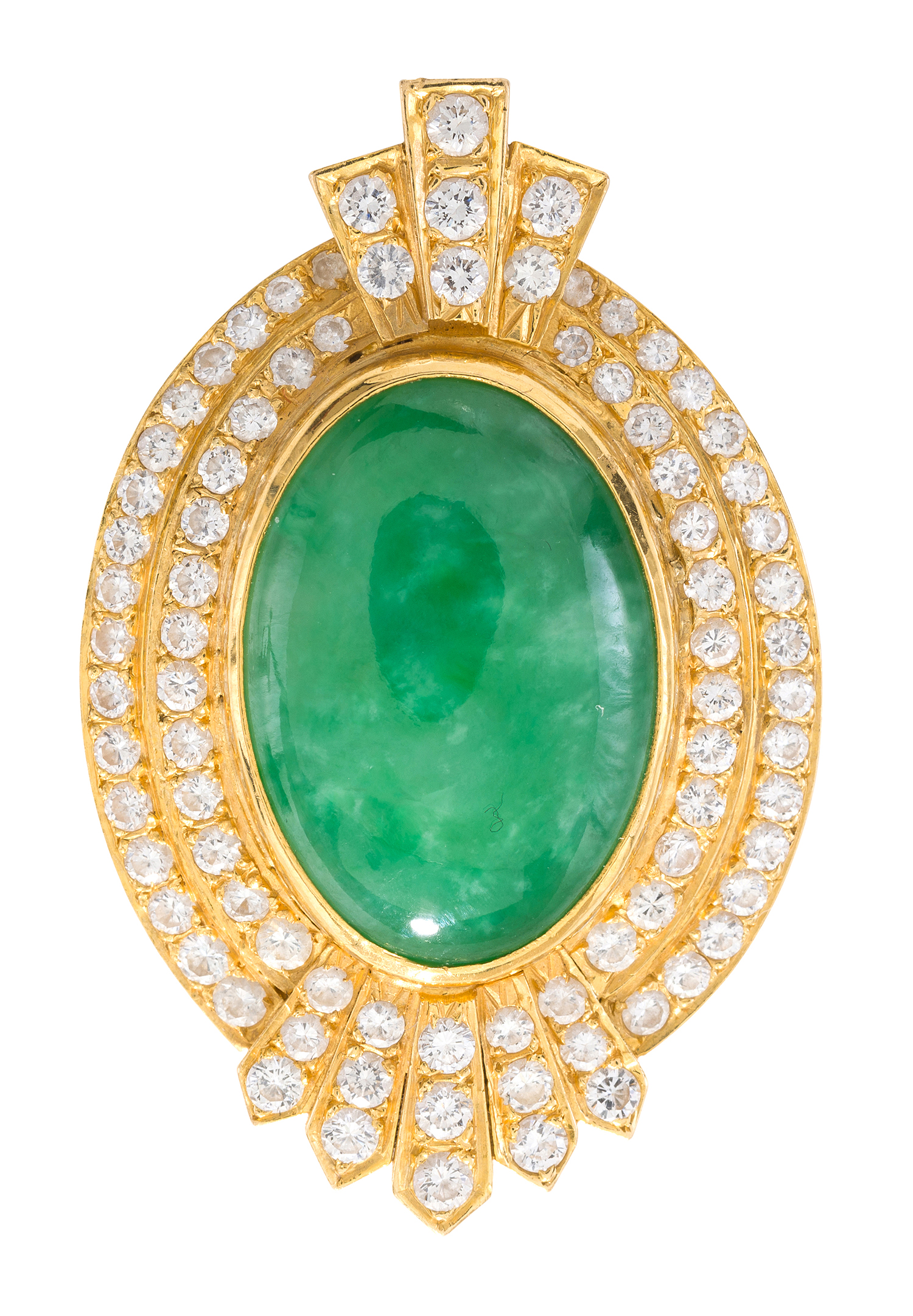 Centrally set with a translucent oval jadeite cut en cabochon, measuring 21.1mm x 15.0mm x 4.25mm, surrounded by round brilliant cut diamonds, mounted in 22ct gold, total length 45mm, accompanied by GSL report number AA59625 stating the jade is of' 'A' type.