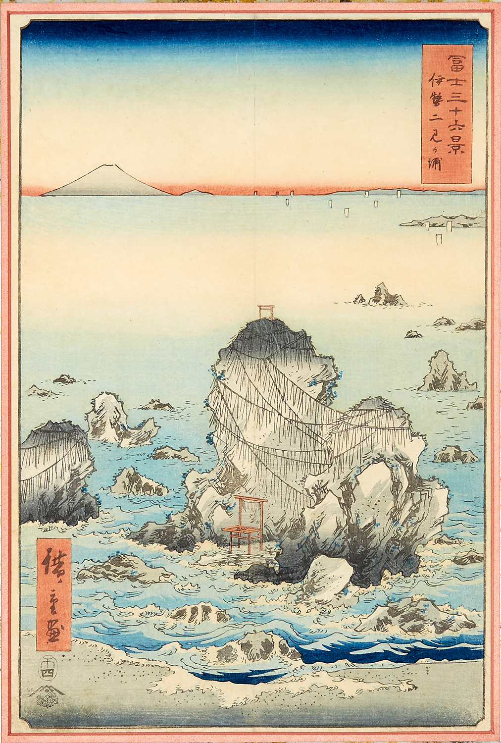 Oban size, woodblock print of Futami-ga-ura in Ise Province from the series Thirty-six Views of Mount Fuji (Fuji sanjûrokkei), 1858, 34 x 23cm
