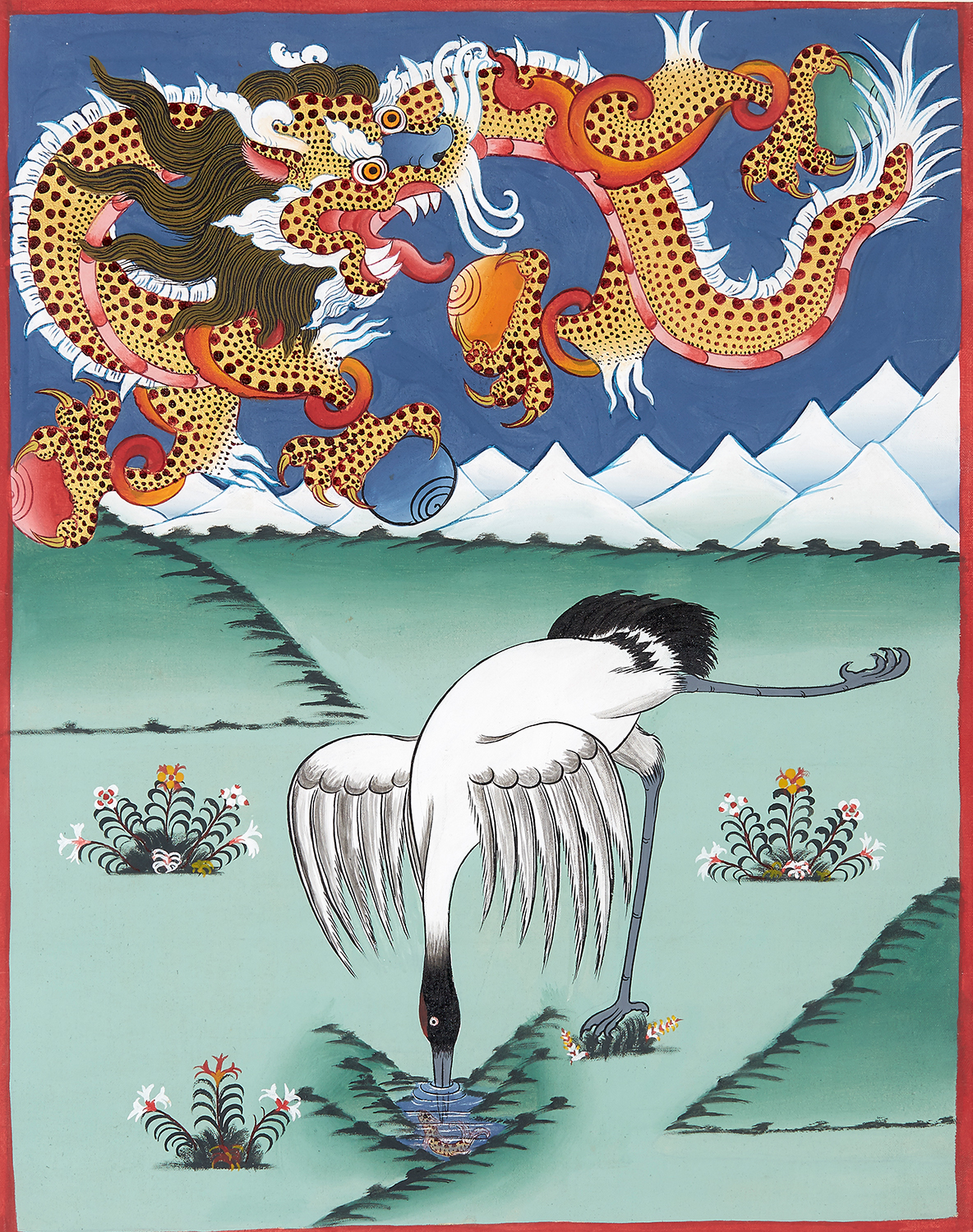 The festive work, brightly coloured and painted with a flying dragon clasping pearls, and a crane standing on one leg, while diving for fish, 45 x 35cm
