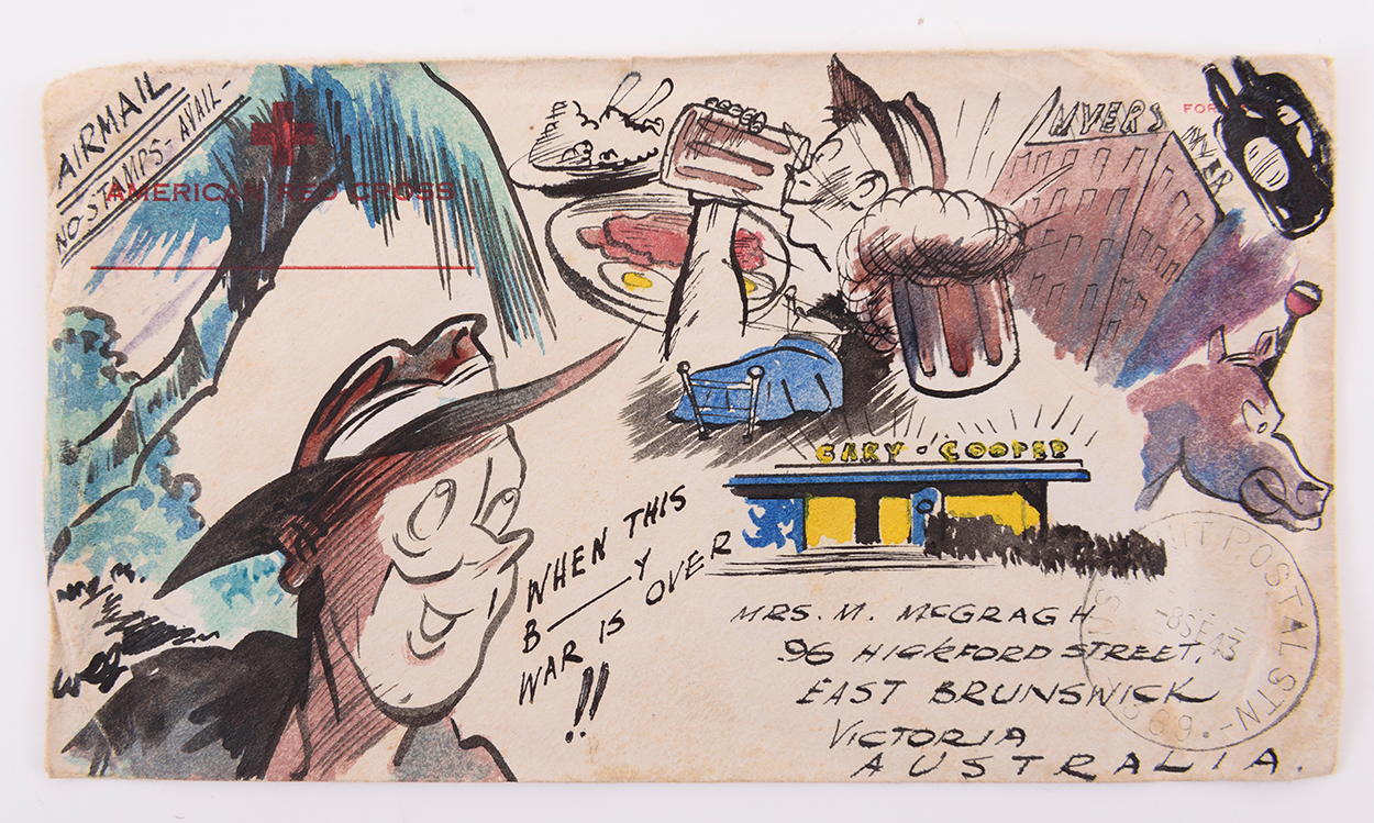 WEG: WW2 ENVELOPE FROM NEW GUINEA TO AUSTRALIA WITH CARTOON DRAWN & SIGNED BY WEG WHEN HE WAS 20 YEARS OLD. "WHEN THIS B____Y WAR IS OVER!! SHOWS A YOUNG AUSSIE IN SLOUCH HAT AND WHAT HE LOOKS FORWARD TO WHEN HE GETS BACK HOME - HIS OWN BED, GOOD FOOD, BEER, GOING TO MOVIES, HORSE RACES, ETC.
