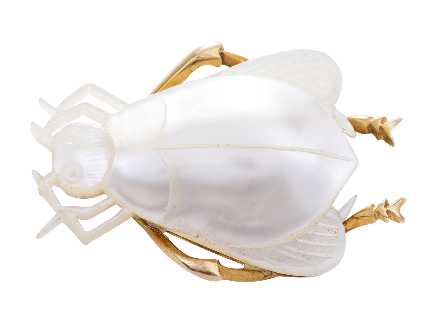 The carved mother-of-pearl insect, mounted in 15ct gold.