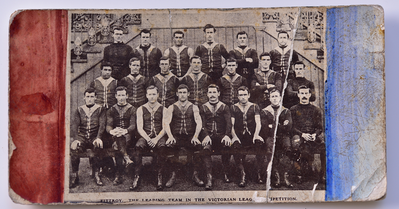 c1905 UNKNOWN ISSUER "FITZROY TEAM CARD". FAIR CONDITION (CREASE AT RIGHT). RARITY 10 - THE CARD ILLUSTRATED ON THE AUSSIE RULES COLLECTABLES WEBSITE.