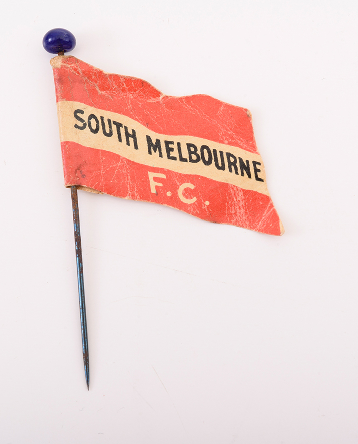 1908 WILLS "FOOTBALL FLAG SHAPED WITH PIN" [1/28] - SOUTH MELBOURNE ("CAPSTAN" ON REVERSE). G/VG.