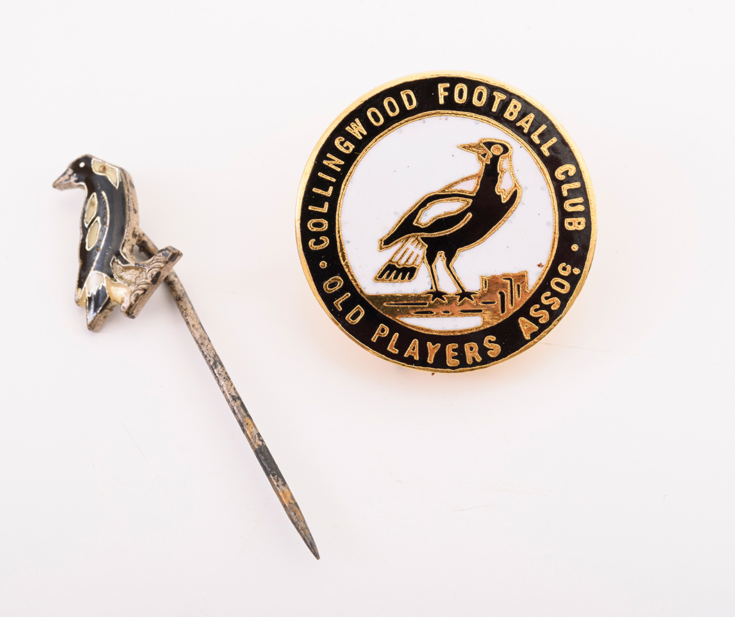 COLLINGWOOD: MAGPIE LAPEL PIN; PLUS "COLLINGWOOD FOOTBALL CLUB/ OLD PLAYERS ASSOC." LAPEL BADGE.
