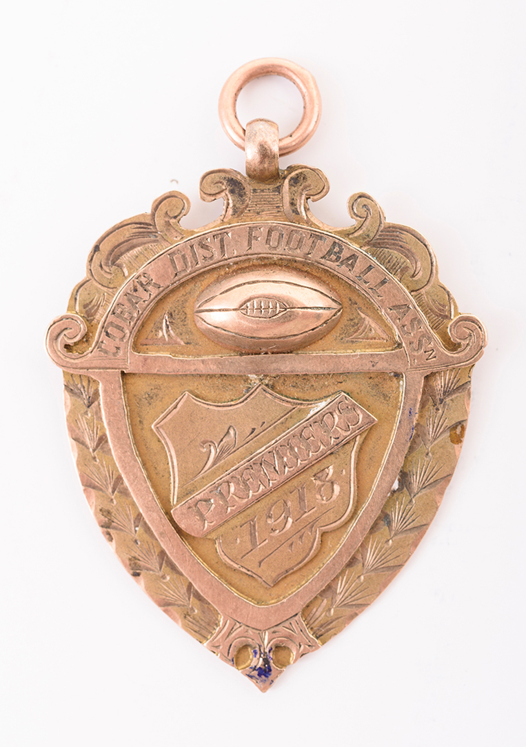 9CT GOLD FOB "COBAR DIST. FOOTBALL ASSN, PREMIERS 1918", ENGRAVED ON REVERSE "WON BY WRIGHTVILLE F.C., F.SATTERTHWAITE".