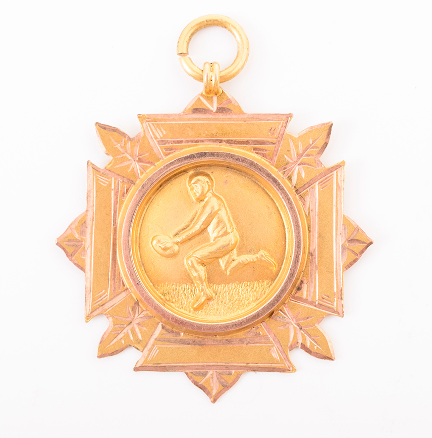 9CT GOLD FOB SHOWING FOOTBALLER, ENGRAVED ON REVERSE "M.F.A. LOCK 9, PREMIERS 1924, F.SATTERTHWAITE".