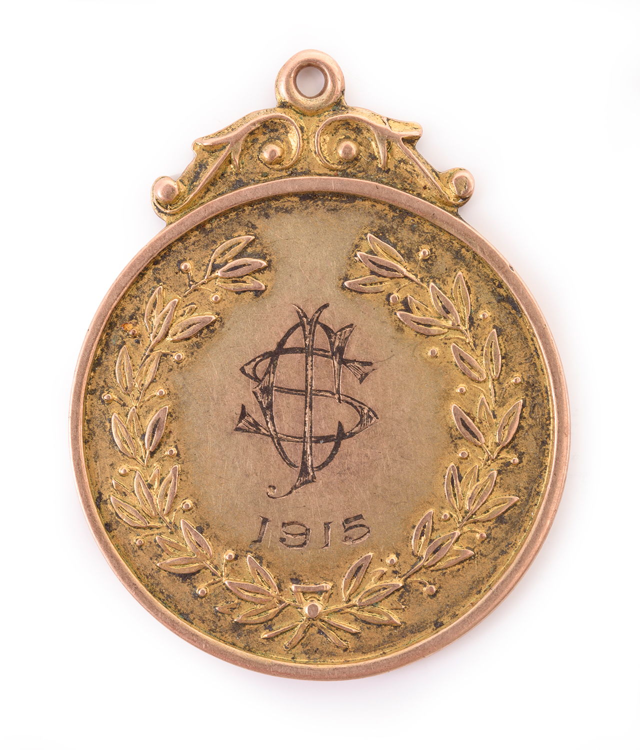 9CT GOLD FOB WITH SJC MONOGRAM ON FRONT (ST.JOSEPHS COLLEGE, HUNTERS HILL), ENGRAVED ON REVERSE "WELTER WEIGHT CHAMPION. F.SATTERTHWAITE".