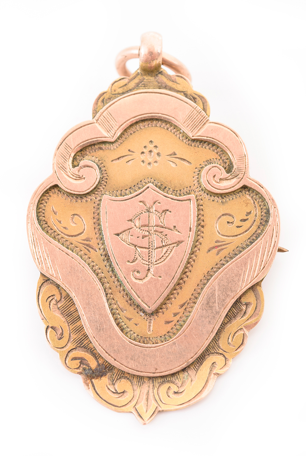 9CT GOLD FOB WITH SJC MONOGRAM ON FRONT (ST.JOSEPHS COLLEGE, HUNTERS HILL), ENGRAVED ON REVERSE "G.P.S. EIGHT OAR CHAMPION, 1916, . F.SATTERTHWAITE NO.3".