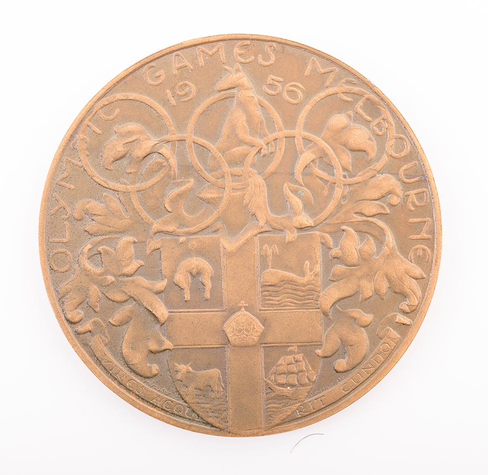 1956 MELBOURNE OLYMPICS PARTICIPATION MEDAL, IN BRONZE, DESIGNED BY ANDOR MESZAROS, 63MM DIAMETER.