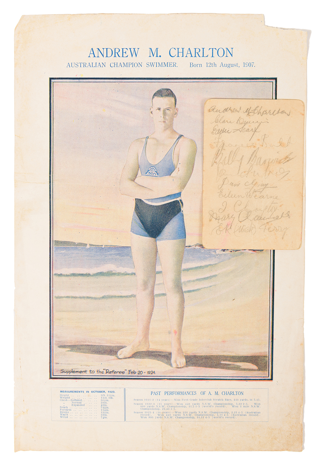 1932 AUSTRALIAN OLYMPIC TEAM: INVITATION TO THE OFFICIAL FAREWELL TO THE AUSTRALIAN OLYMPIC TEAM, WITH 11 PENCIL SIGNATURES ON REVERSE INCLUDING ANDREW 'BOY' CHARLTON, CLARE DENNIS, EDDIE SCARF & DUNC GRAY. TOGETHER WITH COLOUR SUPPLEMENT SHOWING ANDREW CHARLTON.