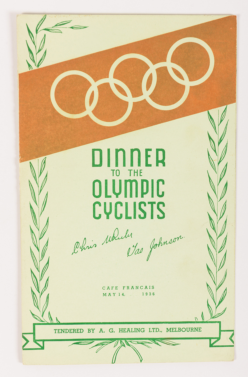 1936 BERLIN OLYMPICS: MENU "DINNER TO THE OLYMPIC CYCLISTS - CHRIS WHEELER & TAS JOHNSON".