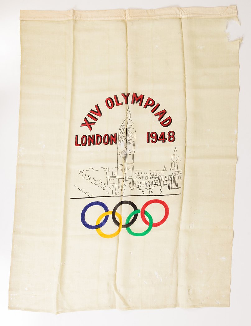 1948 LONDON OLYMPICS: FLAG/WALL HANGING WITH LONDON OLYMPICS LOGO & "XIV OLYMPIAD, LONDON 1948/ (OLYMPIC RINGS)", SIZE 90x122CM. SOME WEAR HOLES & MATERIAL LOSS.